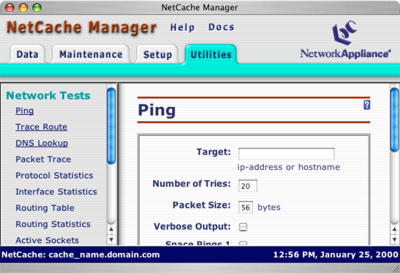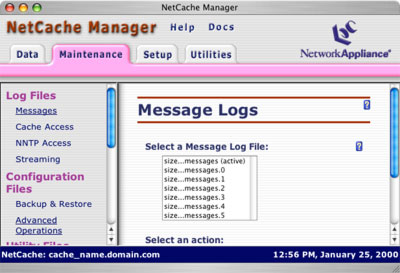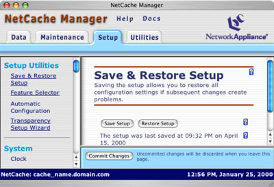 Here's where most of the user interface is buried. This is where you configure the myriad features of the NetCache. When you first set up your NetCache you'll spend most of your time here, but long term, once you've got your NetCache set up the way you want it, you'll probably spend most of your time on the Data and Maintenence tabs.